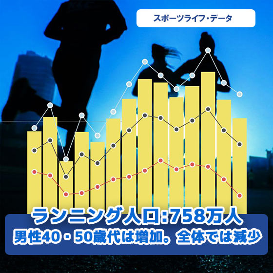 ジョギング・ランニング人口 ジョギング・ランニング推計実施人口は758万人 男性40・50歳代の実施率は増加… 2024年の調査では、20歳以上のジョギング・ランニング実施率(年1回以上)は7.4%、推計実施人口は758万人となり、2020年のピークから減少傾向が続きました。一方で、男性4…